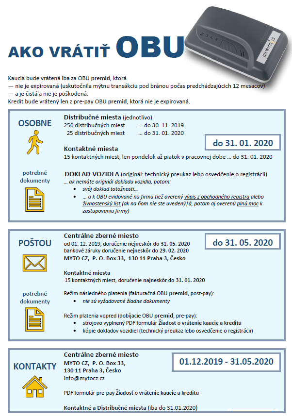 - Pre-pay: nabíjaním OBU – mýto sa odčíta z predplatenej sumy – vratná kaucia 2.468,- Kč