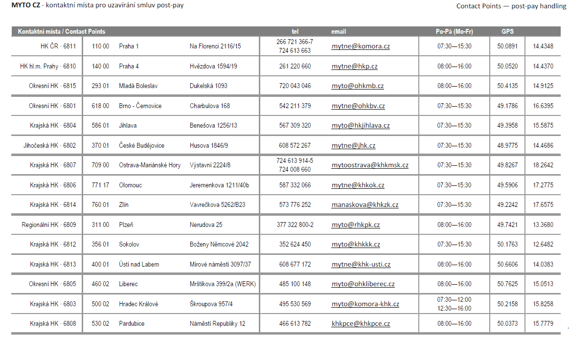 - Post-pay: automaticky pomocou inštalácie palubného prístroja – OBU (On-Board Unit) – vratná kaucia 2.468,- Kč
